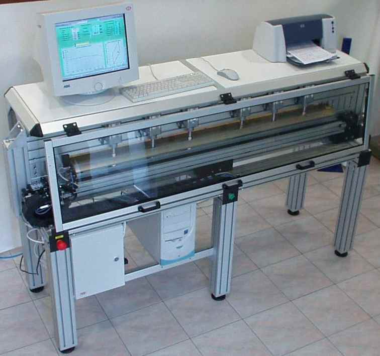Na měřicím stole je vzorek upevněn svěrných úchytem, a tím je při měření zaručena kolmost diferenciálně zapojených dotykových snímačů tloušťky na plochu měřeného pásu. Měření je plně automatické, t.z.n. po zmáčknutí tlačítka se měřící hlavice na lineárním pojezdu přesune po celé šířce pásu, přičemž vyhodnocovací jednotka načte v nastavené periodě vzorkování hodnoty tloušťky a vyhodnotí profil pásu.