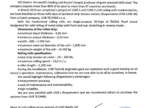 Секционный измеритель натяжения ленты предназначен для контроля и регулирования планшетности металлической ленты на станах холодной прокатки. Принцип оценки планшетности основан на измерении сил давления (прижимной силы) металлической ленты в нескольких чувствительных зонах, составляющих измерительный вал. Лента проходит через данный измерительный вал под постоянным углом от 5° до 10°. Цифровой блок изображает измеренную плоскостность и натяжение по ширине ленты в режиме реального времени на мониторе в виде столбчатой диаграммы и плоского графического изображения.